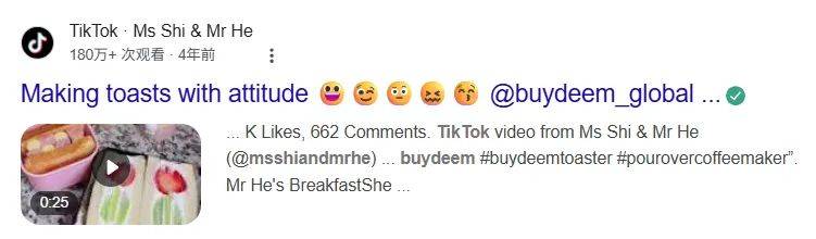 在TikTok上,北鼎与居家美食达人@msshiandmrhe合作推广产品。这位拥有560万粉丝的达人使用北鼎的产品制作了多款美食。