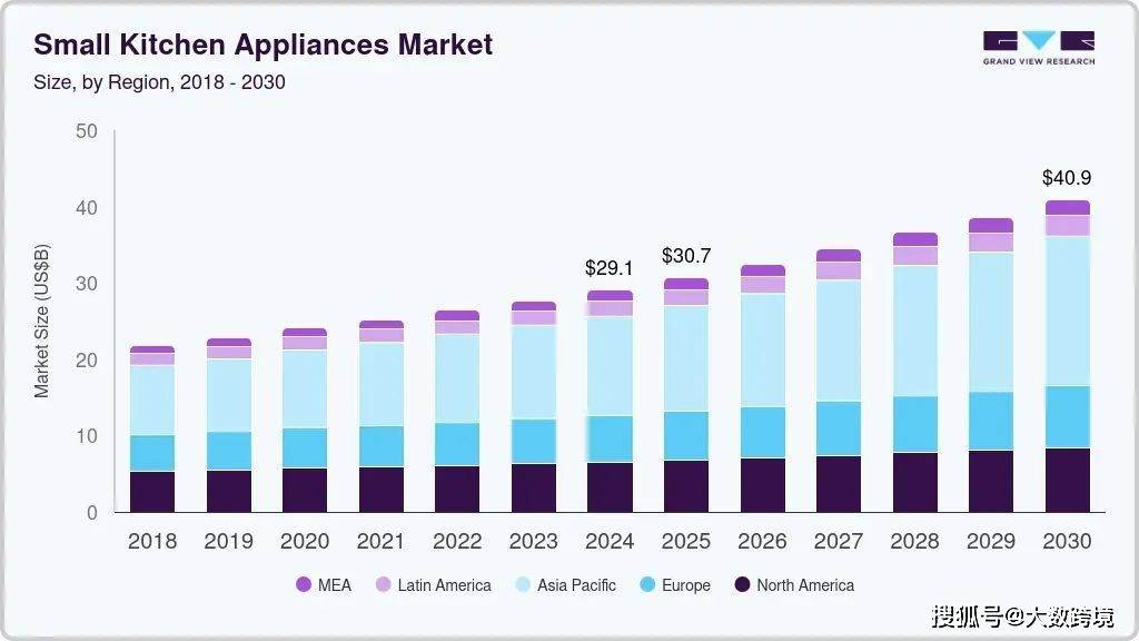 根据GRAND VIEW RESEARCH发布的数据,2024年全球小型厨房电器市场规模估计为290.9亿美元,预计到2030年将达到409亿美元,2025年至2030年的复合年增长率为5.9%。这一宏观趋势为北鼎的持续出海提供了广阔空间。