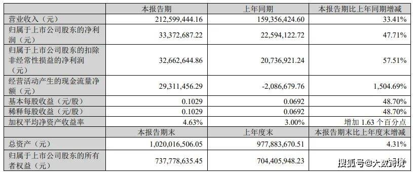 中,公司营业总收入高达2.13亿元,同比增长33.41%,归母净利润3337.27万元,