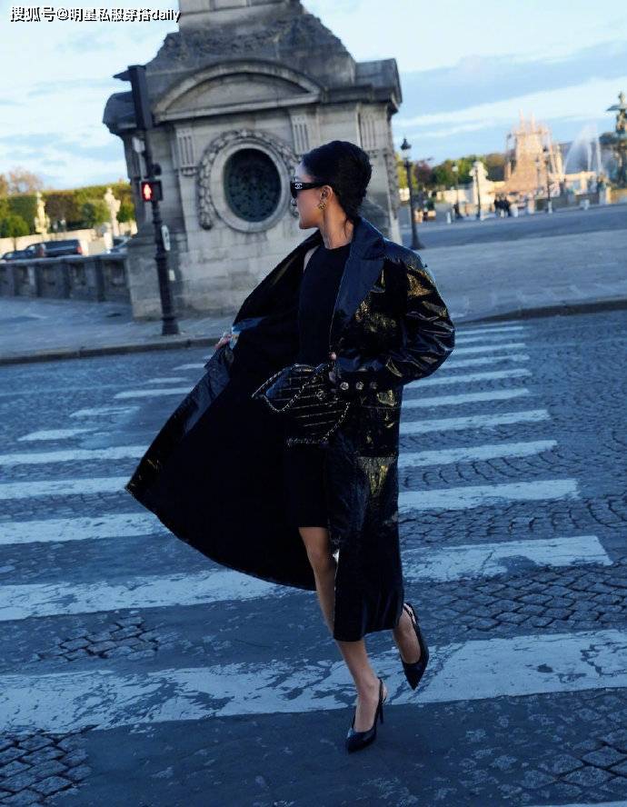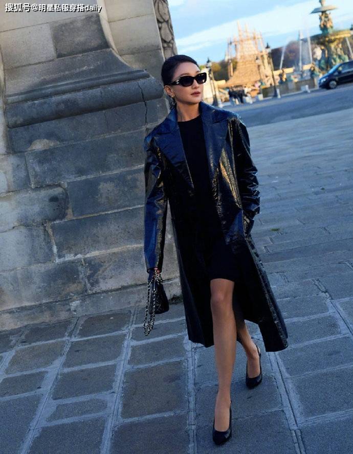 周迅总能给人一种灵动的感觉!虽然已经50岁但周迅在身上还是很时尚很个性!她内搭一件短款黑色连衣裙,长度不过膝盖,而外搭黑色漆皮长风衣,长度在脚踝处,内短外长演绎出不一样的高级感!