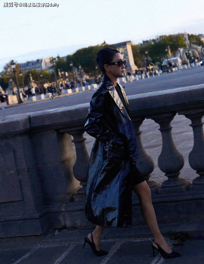 周迅身穿漆皮黑色长款风衣外套,垫肩设计和领口设计,搭配小黑裙,脚踩黑色高跟鞋,搭配黑色墨镜,气质优雅,格外迷人。