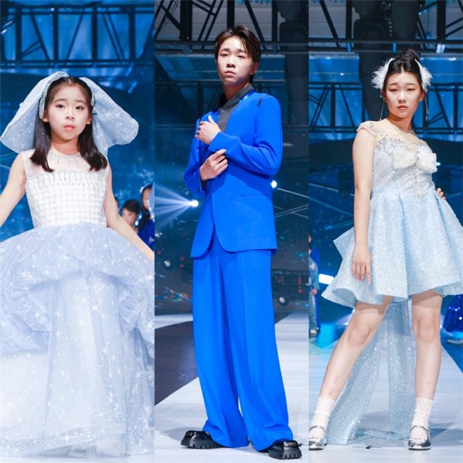 观众席传来此起彼伏的赞叹,镁光灯交织成银河。这些身着蓝绸的小天使,用自信、坚定的步伐,将蔚蓝色礼服的淡雅、婉约、大气,一一展示在T台之上,让千年东方美学在现代时尚中焕发新生。