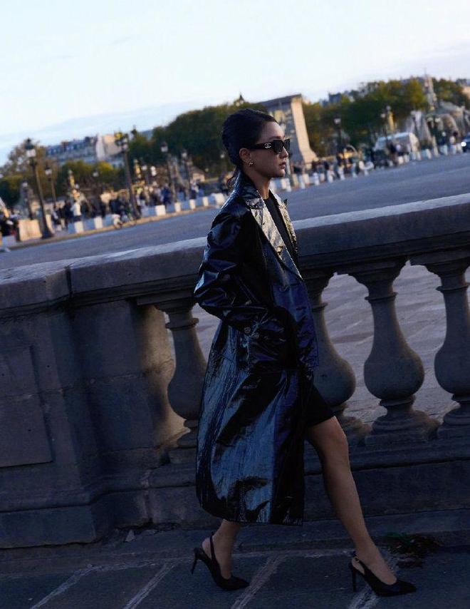 周迅身穿漆皮黑色长款风衣外套,垫肩设计和领口设计,搭配小黑裙,脚踩黑色高跟鞋,搭配黑色墨镜,气质优雅,格外迷人。
